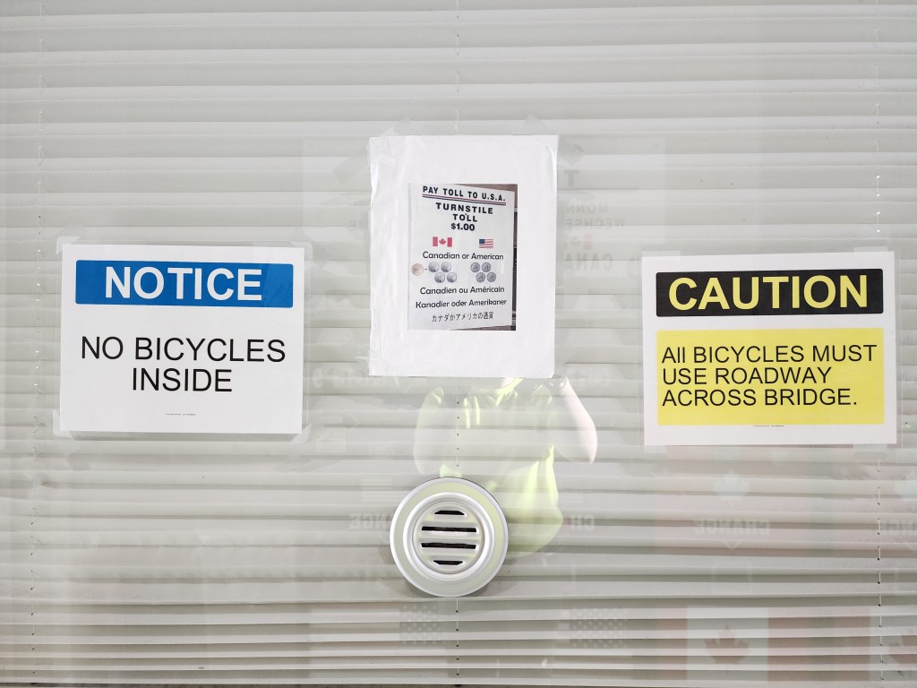 Because we left so early there was very little traffic towards Niagara Falls, but as we got to the border crossing itself, a lineup of cars was already there. Unfortunately the Rainbow Bridge crossing in Niagara Falls doesn’t allow bicycles in the pedestrian crossing. I had to line up with cars. There are signs inside the building stating that you are not allowed to enter with a bicycle.